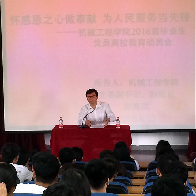 6月15日上午10:00,机械工程学院毕业生党员离校教育党课在机械馆J3教室隆重举行。院党委副书记、副院长郝海滨老师讲授本次党课,机械工程学院党校办公室主任王建洲、副主任王筠涵,毕业班辅导员郭刚军、赵瑞雪以及全体本科毕业生党员到场聆听了党课。