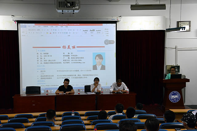 会上,2012级的刘洋、杨美丽、唐俊杰三名同学先后分享了自己的求职经验。刘洋同学介绍道,在简历的制作过程中,简历要写的清晰,要分条表达自己的优点,做到让评审人一目了然。杨美丽同学就简历制作的细节做了更为详尽的介绍,此外,她还鼓励女同学们在面试时要相信自己,把握住机会,积极就业。最后,唐俊杰同学结合自己的实际经历,介绍了求职过程中综合测评、面试问答等具体环节。他提到,寻找自己想要的工作,要从两个方面考虑:一是地域,选择自己适合的地域很重要;二是行业,选择新兴的行业将更有发展前景。