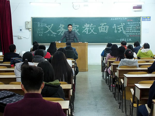 面对主审人员的提问,同学们纷纷讲述自己想参与义务家教的原因:喜欢和孩子相处,想要锻炼自己,想尽自己的力量为社会做贡献等等。一位面试官问道:“为什么参加义务家教活动?”那位学生说:“我从小家庭贫困,受到很多好心人的捐助,我想借助义务家教活动更好地回报社会。”爱心的种子就这样遍地开花。面试官们设置一系列在家教过程中可能遇到的情景来考验面试的学生们,他们严格把关,细心筛选,尽最大努力找出最优秀的同学去帮助孩子。相信孩子们会从这些热情又富有社会责任感的学生家教身上学到课堂知识以外的奉献精神和青春态度。