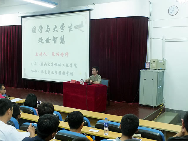 2015年9月19日晚7:00,由乌鸦传媒机械工程学院主办、秦皇岛汇贤雅国学馆协办的“国学与大学生处世智慧”讲座在机械馆J3报告厅举办。本次讲座由北京汇贤雅国学创办人苏兴老师主讲。机械工程学院各级学生积极参与了本次讲座。