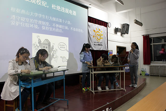 2015年4月29日晚7:30,由阳光心理服务队主办的“安全守纪教育”系列情景剧展演活动在机械馆J3报告厅成功举办。机械工程学院2013级辅导员王明磊、2014级辅导员张佳出席了本次活动。