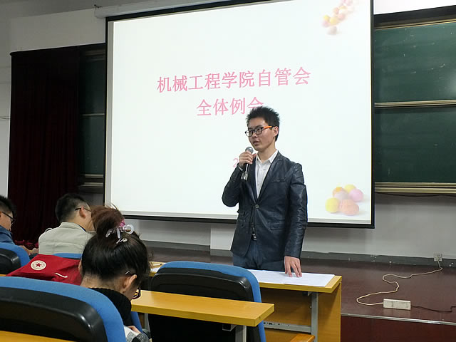 大会第二阶段,机械工程学院自管会召开了全体例会。首先,郭刚军老师对学院自管会2014年秋季学期的工作做了总体的评价。期间,他对全体成员的工作表示了肯定和感谢,同时,对自管会工作中存在的问题和不足进行了剖析。根据校院安全稳定工作的总体要求,郭老师对自管会今后的工作做了规划和部署,并鼓励全体干事积极工作,找准角色定位,提高服务意识和执行力,务必端正工作态度,避免工作漏洞和渎职情况的发生。会议最后自管会全体成员作了交流与互动。期间,自管会主席刘竞成分享自己三年的工作经验,并与干事们进行情感交流,鼓励大家践行自管会的宗旨:一切为了同学,为了同学的一切,为了一切的同学。本次会议圆满结束。