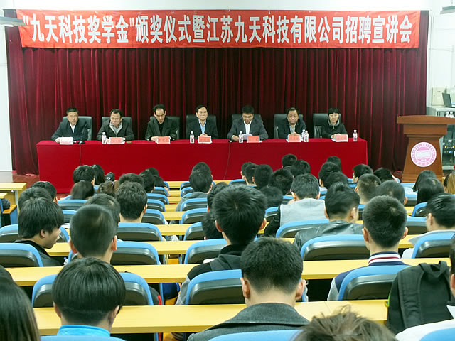 2014年10月26日17:00,机械工程学院在机械馆J3举行 “九天科技奖学金”颁奖仪式暨江苏九天科技有限公司招聘宣讲会。机械工程学院院长肖宏、副院长彭艳、江苏九天光电科技有限公司董事长李国忠、总经理李建忠、副总经理虞惠忠、总工程师曾三荣等出席了本次颁奖仪式。此次颁奖仪式由机械工程学院党委副书记、副院长陈革新主持。