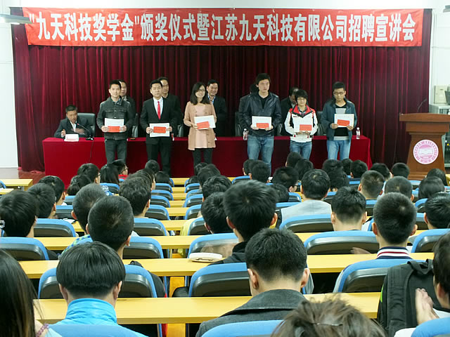 此次颁奖仪式充分体现了社会企业单位对教育事业的关怀,也进一步加深了机械工程学院与江苏九天光电科技有限公司的情谊,为今后的进一步合作搭建了更稳定的平台,同时,也希望社会各界的有识之士能够加入到校企联合的过程中来,实现合作育人、合作就业、合作发展的目标,共同为国家培养高素质综合型人才!随后,江苏九天光电科技有限公司在J3举行了招聘宣讲会。