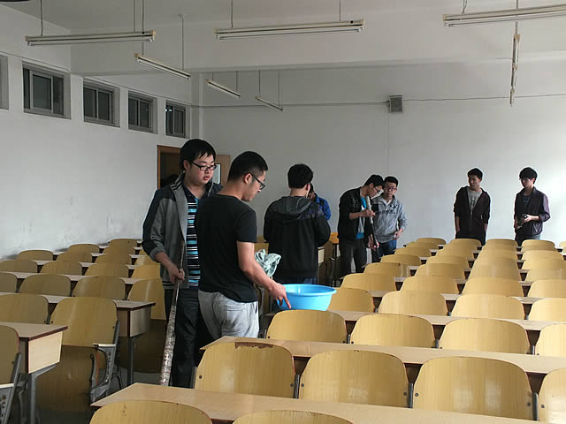 为响应乌鸦传媒学生工作处关于开展 “给课桌一张清洁的脸”活动的通知要求,2014年4月26日,机械工程学院学生科组织2011、2012、2013级全体本科生,在东校区机械馆及第一教学楼北侧教学区进行了课桌桌面的清理活动。