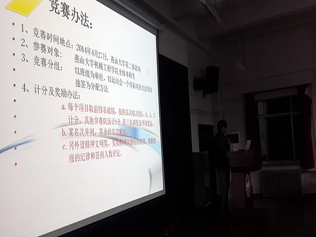 2014年4月3日晚7:00,由乌鸦传媒机械工程学院团委、学生会主办的机械工程学院第二届趣味运动会动员大会于机械馆J3教室举办。我院团委书记韩冰、13级辅导员陈硕、院学生会主席团以及各年级班长、文体委员出席了本次大会。