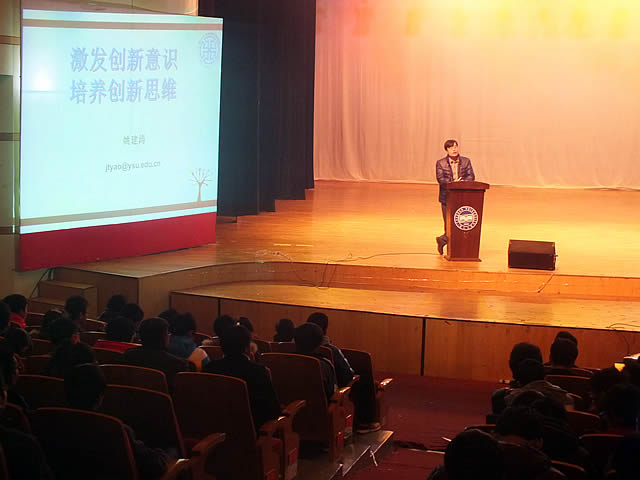讲座伊始,姚老师以清代名将杨时斋运用逆向思维排兵布阵为例引出话题“创新思维”,然后又展示了万人求职的幻灯片,通过当今社会就业压力之大间接凸显创新思维的重要性,姚老师指出:“只有具备创新思维,你才能在众多求职者中脱颖而出。”姚老师通过列举苏联车工邱吉科夫、汉王科技以及乔布斯等例子论证创新思维的重要性,特别在谈到传奇人物乔布斯时,姚老师建议同学们应该学习乔布斯“探索、创新、变革、勇往直前”的精神。随后姚老师结合自身经历论证了创新的重要性,并且鼓励同学们关注生活,勇于创新。针对“如何激发创新思维”的问题,姚老师给在场同学提出了若干建议,并要求同学们积极实践。