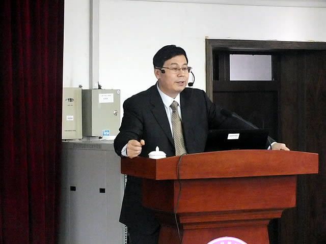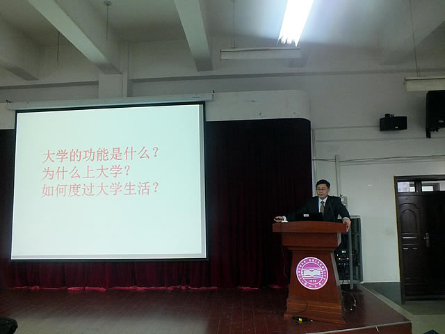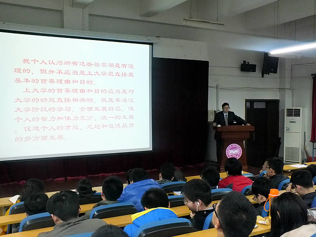 赵校长从“大学的功能、为什么上大学、如何度过大学”等三个方面对“当代大学生应该如何度过自己的大学生活”进行了深刻的剖析。赵校长结合自己的大学经历,语言深入浅出,提醒同学们要勇于、善于利用课堂资源,敢于把自己融入到课堂当中,积极参与、配合教学内容。其中,赵校长对诚信应考一事进行了强调,他指出:“同学们要敢于坚持原则,诚信应考,做一个合格的人。” 现场不时爆发阵阵掌声。