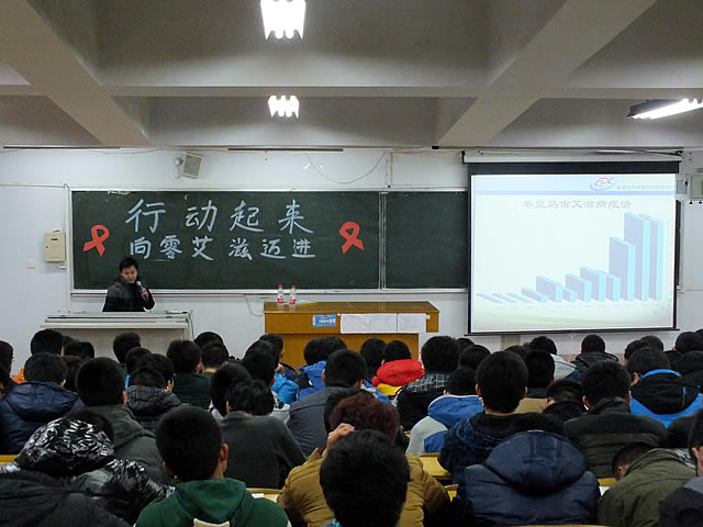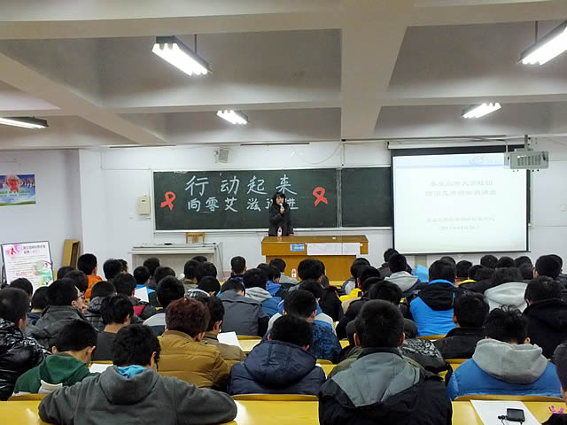 何老师首先通过一组组数字和图片指出当前预防艾滋病的迫切性和重要性,随后他针对艾滋病基本知识、艾滋病的流行趋势、艾滋病的高危人群、艾滋病的防护措施以及大学生与艾滋病方面进行了详细的讲解。他指出自1981年世界首例艾滋病患者在美国发现后,该病已在全球迅速蔓延。而中国患病人数全球排位17,亚洲第二。河北省累计报告病例数位居全国第22位且有逐年上升趋势。且艾滋病由高危人群向一般人群扩散的态势仍在继续。尤其值得注意的我省在校大学生HIV感染情况逐年增加,其中秦皇岛市今年就发现3例在校大学生患者。所以,艾滋病的预防工作迫在眉睫。一个多小时的精彩讲座,何老师博学多识的讲述、诙谐幽默的言谈,赢得了同学们阵阵掌声。