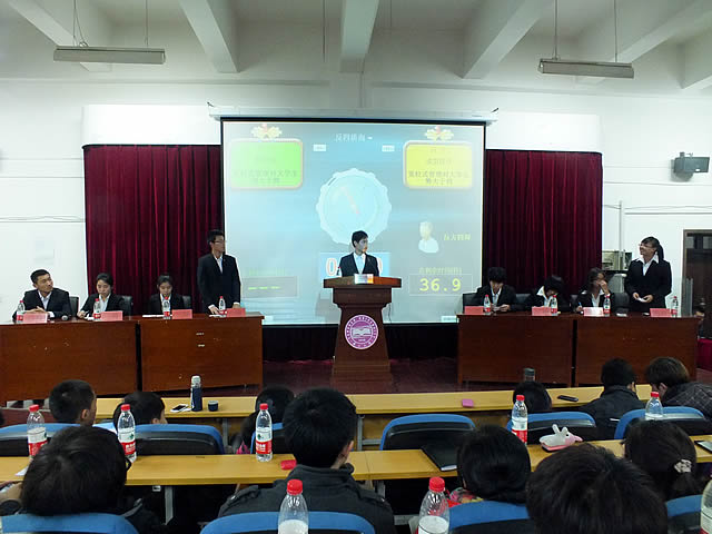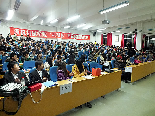 深秋的J3教室外寒风阵阵,但教室内早已人声鼎沸,热闹非凡,比赛还没开始,观众都已到场,期待着即将开始的决赛之战。晚上7:30,比赛正式开始。作为暖场的表演赛是由机械工程学院代表队对阵我校的外国语学院代表队,双方围绕“外国语学院的男生是否比机械院的女生更幸福”展开了风趣幽默的辩答,双方辩手妙语连珠,互不相让,比赛现场爆发出一阵又一阵欢快的笑声。辩论结束后,评委对双方的辩答做了简要评价,经过短暂的中场休息,本届机械杯决赛环节正式开始。正方——来自我院的联合组辩论队与反方——来自我院13级成型四班的辩论队一开场便展开了唇枪舌战,火力十足,双方在辩论中针对“宽松式管理对大学生的利弊”进行激烈辩驳,现场充满了紧张气氛。自由答辩环节,更是高潮迭起。双方答辩结束后,评委组经过讨论后宣布,本次“机辩杯”决赛的胜方是正方联合组辩论队。韩冰老师、陈硕老师、王明磊老师分别为比赛的第一、二名和最佳辩手颁奖,场上爆发出了热烈的掌声。