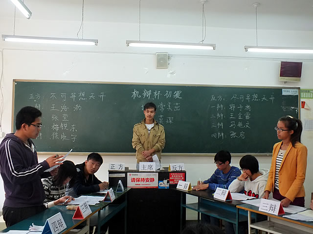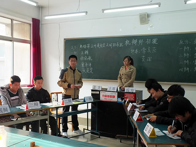 深秋的清晨已是凉意阵阵,但这并未消减参赛队伍的热情。比赛开始前二十分钟,各支队伍已经开始集合并签到。八点钟,比赛正式开始,各支队伍依次进行两两PK赛。由于已参加数次培训,各个参赛队伍在赛场均显示出了十足的信心。值得一提的是,本届“机辩杯”辩题突破传统,紧跟社会热点并密切联系学习生活,例如“离婚率上升是否为社会文明的表现”,“机遇是否比努力更重要”等,参赛队伍紧扣本方观点进行激情洋溢的辩述。在自由辩论环节中,各支队伍围绕着己方的观点展开了唇枪舌战,比赛现场充斥着紧张的氛围。一番激战之后,评委针对正反方队伍的优点与不足进行点评,让每一个参赛的队员都收获颇丰。十一点半,本次比赛圆满结束,并产生了进入复赛的19支队伍,第一教学楼中沸腾的掌声再次响起。