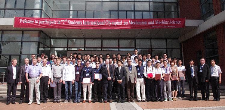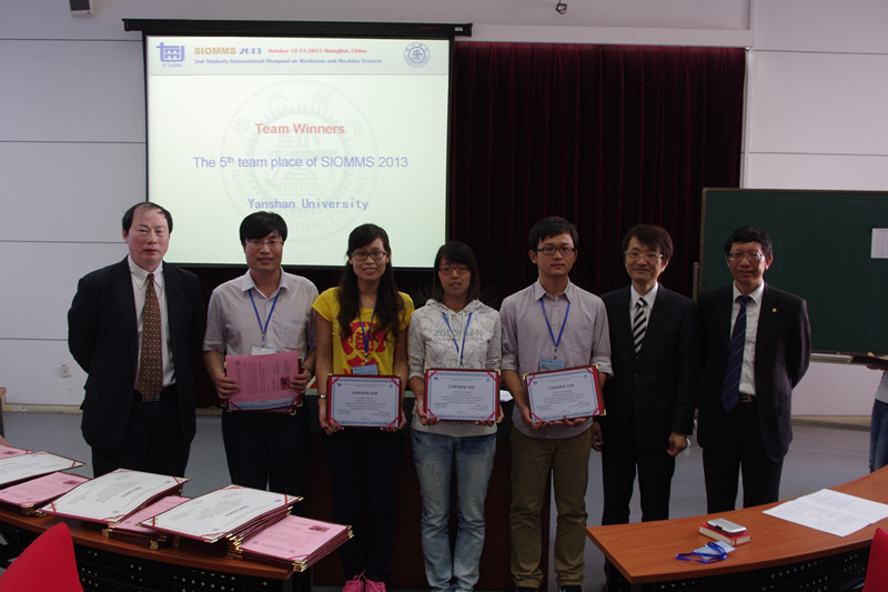 2013年10月12—13日,第二届“机构学与机器科学”国际奥林匹克竞赛(2nd Students International Olympiad on Mechanism and Machine Science, SIOMMS 2013)在上海成功举行,我校参赛选手金林茹、刘宇和刘晓飞同学(指导教师:赵永生、姚建涛)以中国区奥赛选拔赛中团体第二名的优异成绩成功获得国际奥林匹克竞赛参赛资格,并在国际竞赛中再创佳绩,获得团体第五名的优异成绩,颁奖嘉宾IFTOMM主席Yoshihiko Nakamura对我校选手取得的成绩表示了肯定和祝贺并合影留念。