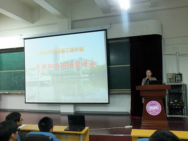 2013年10月11日19点,由我院团委、学生会主办的大学生暑期社会实践活动宣讲会在机械馆J3教室成功召开。出席此次大会的嘉宾有团委书记韩冰和团委副书记陈硕。大一各班也派出了代表参加宣讲会。