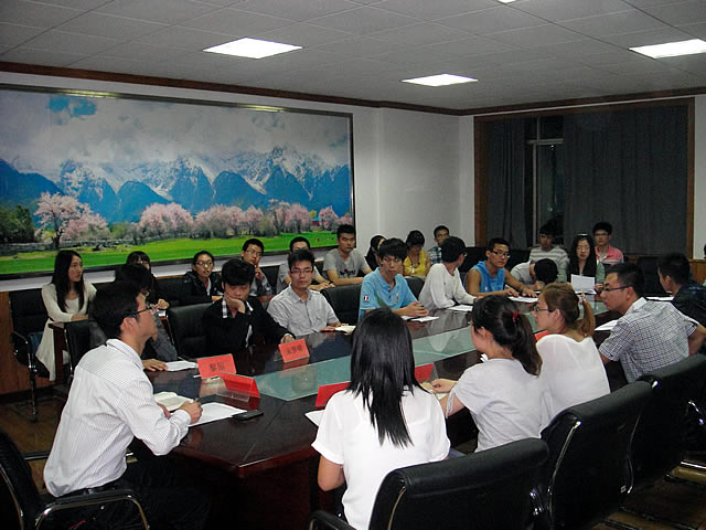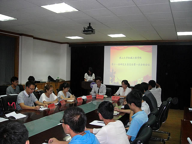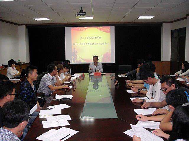 第十一届院研究生委员会第一次全体例会召开 韩冰老师讲话 研会主席魏泽利做最后总结 9月13日晚上7:00,第十一届院研究生委员会第一次全体例会在机械馆327举行。 机械学院团委书记韩冰老师出席。研究生会主席魏泽利、副主席黎原、孙玉双、各部门部长及全体研究生会成员到场。研会秘书处处长押媛媛主持会议。 在庄严的国歌声过后,全体学生向韩冰老师表达了教师节的问候和深深的谢意。韩冰老师发表了讲话,围绕研会的主要任务,研会成员的职责,研会需要承担的义务,韩冰老师做了精简的叙述。强调了院研究生会负责服务机械院千余研究生的任务的重要性,并从思想方面对研会全体成员做出了指导。 在宣读了新部员名单后,秘书处、学术部、文体部、组织部、外宣部各部长依次发表了讲话,向新部员全面的展示了目前院研究生会的构成和主要职能。同时,也让各位部员了解了自己具体的职责。之后,研会副主席黎原为大家播放了ppt资料,展示了研会以前举办的一些活动,包括迎新生,硕博篮球赛,博士生论坛,院研究生交流会等活动,为新成员展示了一幕幕精彩的画面。研会主席魏泽利发表了总结发言,发言激情豪迈,肯定了研会在过去十年里的努力,同时提出了研会内部需要团结、互助,发展需要衷心付出,热心激情。最后,魏泽利主席为研会规划了一些基本的发展路线,鼓舞了全会的士气。 会议在大家热烈的掌声中结束,我院研究生委员会打开了新的篇章。