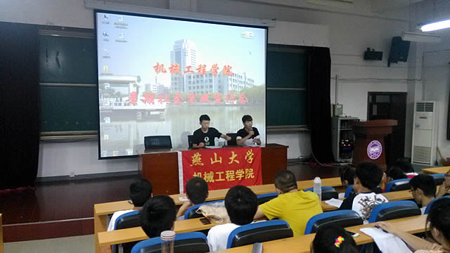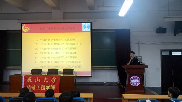 暑期社会实践活动是大学生在校期间参加社会实践的一个重要途径,为更好地指导学生开展2013年的暑期社会实践活动,2013年6月23日晚七点,由机械工程学院团委学生会主办的2013年暑期社会实践动员大会在机械馆J3教室拉开帷幕。出席此次会议的有我院团委副书记陈硕,院学生会公关实践部部长赫连勃勃,副部长周均博和付元奇。