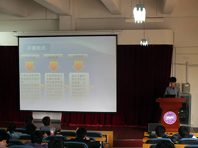 在饱含激情的开场白之后,参赛选手分别通过ppt讲解和现场答辩来展示自己为即将到来的2013年暑期社会实践浪潮所做出的设计与规划。走进基层,调查现状,石婷同学志在关注留守儿童;寻访党员,秉承精神,徐旭同学希望在红色之旅中收获精彩;心手相牵,关注民生,王嘉骥另辟蹊径,从环境保护的角度开展课题……参赛作品覆盖面广,可行性高,在现场掀起了一阵又一阵的高潮,赢得了现场观众的热烈掌声。其中王嘉骥同学从活动背景、计划安排、团队优势等方面将他的海洋环境保护计划娓娓道来,条理清晰,思考全面,在答辩环节中独到的回答评委提问,虚心接受评审团给出的建议,赢得了评委们的好评。