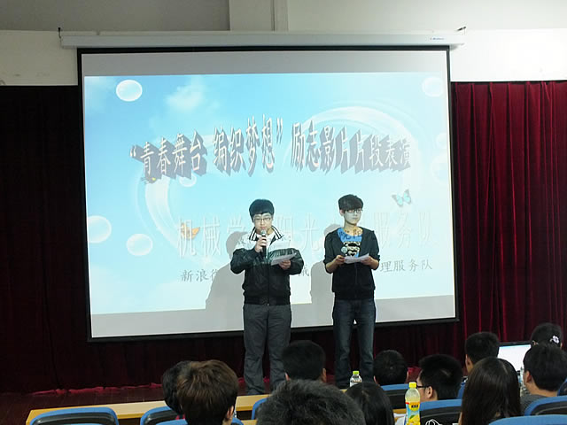 2013年5月16日晚7:00,由机械工程学院阳光心理服务队主办的以“青春舞台,编织梦想”为主题的青春励志电影片段表演赛初赛,在机械馆J3拉开帷幕,担任本次活动的评委有我院雷锋突击队队长袁观阳,学生会文艺部部长王智毅,阳光心理服务队队长刘阳,副队长陈丽娟,以及特邀嘉宾林道山。