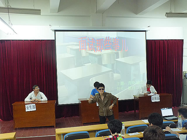 本次比赛共有11个班级参赛,各个参赛班级不拘泥于形式,为同学们带来了一个个感人、清新、搞笑的电影片段。《转校生》以一个桀骜不驯的高中男生为主线,展示了他不断成长,逐渐学会宽容和团结的经过;《青春的诗》以优雅的旋律,优美的辞藻,演绎了我们不断追逐,却渐渐远去的青春;《面试那些事》以一个大一新生迷茫的面试经历,展开剧情,逐步深入,结尾主席点明主旨。各位演员热情饱满,发挥地淋漓尽致,但比赛就要有先后,最终12级机自9班、12级机自11班、12级成型1班、11级机自10班、12级机自2班、12级机自5班7个班级晋级决赛。