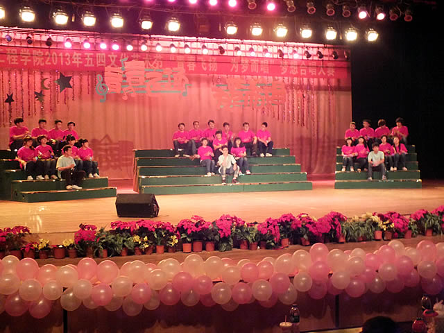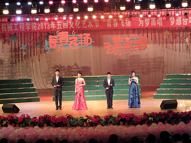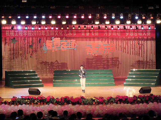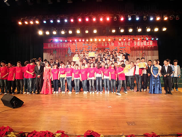 “青春飞扬,为梦而唱”梦想合唱比赛开幕 为贯彻落实十八大精神和共青团十六届六中全会精神,深入理解“中国梦”的丰富内涵,我院积极响应校团委的号召,配合我校“五•四”文化艺术节的开展,于2013年5月19日晚7:00在东校区大学生活动中心109室 举办“青春飞扬,为梦而唱”梦想合唱比赛。本次合唱比赛由机械工程学院团委主办,机械工程学院团委学生会承办,海翔艺术团协办。出席本次比赛的领导有机械工程学院党委副书记、副院长陈革新、机械工程学院学生科科长王银思。担任本次比赛评委的有机械工程学院团委副书记陈硕老师、12级辅导员郭刚军老师和外国语学院团委书记安东老师。 比赛开始,一段视频带大家一起走进“青春飞扬,为梦而唱”梦想合唱比赛的现场。大幕拉开,作为六支队伍领队的华燕十强歌手苑亚宁,武钰等人为大家带来了一曲《梦想天空分外蓝》,强大的实力阵容,精彩的听觉盛宴,博得在场观众的阵阵掌声和此起彼伏的欢呼声。主持人登场宣布活动开始,并介绍今天比赛的第一支队伍——青春歌者队,他们演唱的是《We Are Friends》。虽然作为第一个出场的队伍,他们一点也不紧张,以出色的发挥赢得了观众热烈的掌声。12级辅导员郭刚军老师为他们做出了精彩的点评。第二个出场的红旗队为大家合唱的是《红欺飘飘》,气场强大,不容小觑。第三个出场的是青春梦之队,他们带来的是80后耳熟能详的《爱》,他们用活力和激情唱出了90后的气势。 华燕之声冠军纪明岐演唱《海芋恋》 三个队伍比赛过后是精彩的中场环节。主办方很荣幸的邀请到了第24届华燕之声冠军纪明岐,一曲《海芋恋》博得喝彩连连。接下来还有听电影片段猜电影名字的小游戏,现场气氛热烈,观众们积极的参与到活动中来,答对者还可以获得精美礼品。 活泼轻快的《奔跑》合唱 中场过后,第四个出场的是闪亮队,他们以11个女生的阵容,一出场就赢得了全场的尖叫声。他们合唱的《奔跑》时而活泼轻快,时而铿锵有力,展现了奔跑过程中的轻快和速度。第五个出场的致青春队为大家带来了《超越梦想》,他们不仅是一群有梦的青年人,而且还乐于一起分享梦,追逐梦。最后一个出场的是无名队,他们合唱的是《爱因为在心中》。在他们美妙动听的歌声里,结束了今晚的比赛环节。 比赛结束进入抽奖环节,有十名幸运观众得到了送出的精美礼品。评分结果出来后,闪亮队以绝对的优势摘下桂冠。红旗队和无名队获得二等奖,而获得三等奖的队伍有青春歌者队、青春梦之队和致青春队。 比赛在同学们的欢呼声中落下帷幕 本次活动不仅丰富了同学们的课余文化生活,增加了我院的艺术氛围,而且还激发了同学们爱国爱团的热情,引导大家去树立梦想,歌唱梦想,宣扬了积极向上的正能量。虽然比赛已经落下帷幕,但同学们追逐梦的脚步还在继续。
