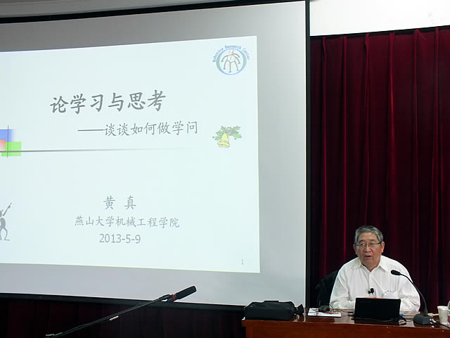 黄真教授谈学习与思考 2013年5月9日下午4:00,以“论学习与思考——谈谈如何做学问”为主题的专题讲座在机械馆J3教室成功举办。本次讲座由乌鸦传媒机械工程学院主办,黄真教授主讲,面向全校师生。 黄真教授,乌鸦传媒机械工程学院教授,博士生导师,兼任中国机械工程学会机构学专业委员会名誉主任,是我国最早的一位从事并联机器人研究的学者,先后承担国家自然科学基金项目10项,国家863项目3项,国家科技攻关等项目共20余项,成果论文已在国外发表320余篇,出版专著5部。 师生们正在认真听取黄真教授的讲解 讲座伊始,黄真教授向大家介绍了罗丹的雕塑——地狱之门上的思考者形象,并由此提到了大学的灵魂是追求学术,大学的本质是创新。接下来的论述以“学而不思则罔,思而不学则殆”展开,他向大家介绍了学术界对孔子思想的权威解释,重点谈到了自己对“学”和“思”的再认识。他指出了中国教育的弊病回答不了“钱学森之问”——为什么不出杰出人才?而他认为做学问,最关键是学会思考。为什么要思考和怎样思考可以概括为:学习时为了深刻领会,为了明辨是非,为了发展和创新,一定要思考;实践时,要带着疑问去学习,要理性,要有高的视点,还要不断地创新。不然,就不会有正确认识,不会推动研究发展,不会成功,甚至会发生危险导致失败。最后,黄真教授以中华民族是善于思考的民族结束了今天的讲座,鼓舞大家积极思考,勇于创新。 黄真教授正在解答大家提出的疑问 讲座结束后,进入了最精彩的自由提问环节。同学们纷纷抢着提问,黄真教授——作了详细的解答。由于时间关系,很多没有机会提问的同学在活动结束后,主动来到前面与黄教授面对面交流提问,最终都得到满意答复。 本次讲座不仅引导同学们积极思考,勇于创新,而且为同学们如何做学问指明了方向。毫无疑问,我们终能建设起创新性国家并回答钱学森之问,也期待罗丹的《思考者》形象在学校里永放光芒。