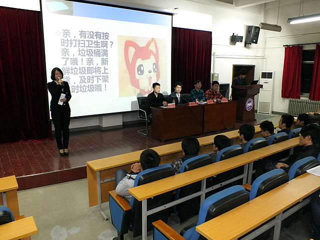 魏泽利和李猛超分别介绍了自管会组建的初衷以及任务和宗旨和自管会工作的重要性及流程。而后学长们播放了他们工作的视频,使大家对自管会有了一个全新的认识。他们还就最近发生在高校的几起事件谈了自己的看法,教育我们要注意保持室内清洁,不要晚归或夜不归寝。最后说道,自管会是为大家服务的,希望以后支持他们的工作,多给他们一些鼓励和宽容。如果说前两位学长是从自管会的专业的方面给我们讲述的话,接下来的这位赫连勃勃学长则是从我们的角度出发分析问题,谈到了整体宿舍的风气、氛围对所有宿舍成员的影响,现身说法,引起了大家的共鸣。