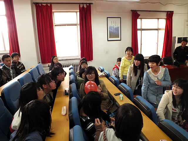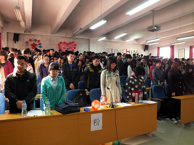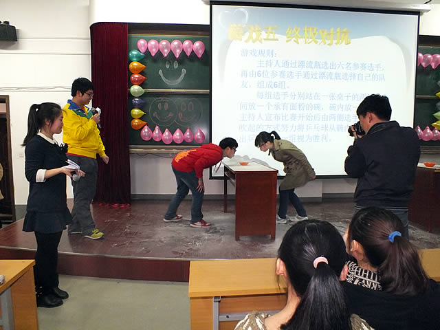 2013年4月21日下午4:00,由机械工程学院阳光心理服务队及外国语学院学生会联合举办的“阳光心理漂流瓶”活动在机械馆J3教室拉开帷幕。 本次“阳光心理漂流瓶”活动主要是为了缓解同学们生活与学习的压力,促进同学之间的交流,增进学院之间的友谊。在活动开始之前,在场所有人员起身默哀三分钟,以此来表示对四川雅安地震遇难者的哀悼,场面庄严肃穆。 同学们为四川雅安地震遇难者哀悼 随后,活动正式开始。一个由一组人接力将气球从队尾吹到对首的“海风呼啸”活动成功地缓解了压抑的气氛。伴着同学们逐渐高涨的情绪,游戏也变得更加精彩。活动的种类很多,例如: 两人一组的猜图活动;逻辑推理的小游戏;考验反应速度的相反口令训练活动;还有那最让人心跳的吹乒乓球活动等等。场上参与者的表现异彩纷呈,场下观众的欢呼声更是震耳欲聋。“我今天真的玩的很开心,很希望以后可以多举办一些类似的活动!”一位同学如是说。最后,活动在一片欢乐的氛围中圆满结束。 同学们正在做气球接力游戏 两同学正在吹乒乓球 本次“阳光心理漂流瓶”活动,使同学们放松了身心、缓解了压力,让同学们能够更好地投入到接下来的学习中。同时,本次活动不仅丰富了同学们的业余生活,充实了同学们的心灵世界,而且更加增进了同学之间的友谊,促进了大学生的全面发展。