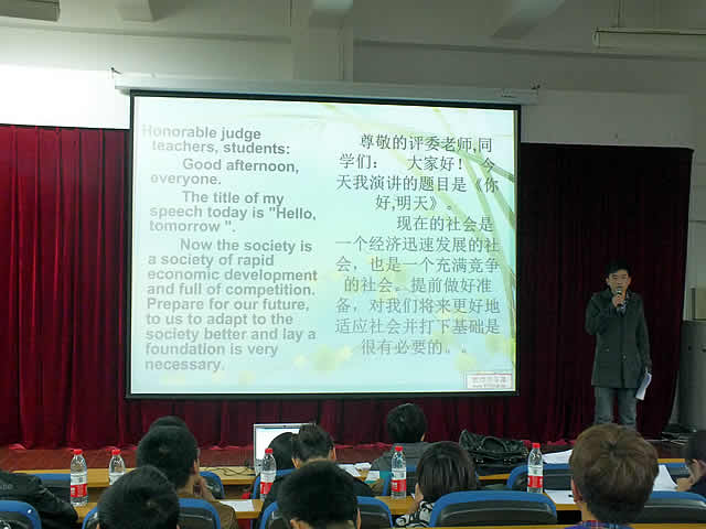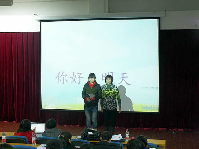 2012年11月15日下午4:00由机械工程学院就业发展协会举办的“你好,明天”英语演讲比赛决赛在机械馆J3报告厅拉开序幕。本次比赛旨在帮助同学们认清人生方向,树立人生目标。与此同时,增强同学们的英语交际口才能力,提高学生未来的求职竞争力。学院团委书记王银思老师、就业指导办公室主任高帆老师以及辅导员庄杉、陈硕、沈鹏超、张佳、郭刚军老师出席了本次比赛并担任此次比赛的评委。