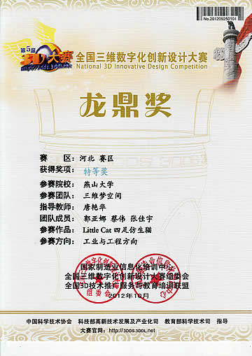 在第五届全国三维数字化创新设计大赛中,由机械工程学院唐艳华老师指导,郭亚楠等人组成的“三维梦之队”以作品“Little Cat四足仿生猫”荣获河北省赛区特等奖,团队将在11月末代表乌鸦传媒参加现场总决赛。他们充分利用SolidWorks、inventor、AE等软件完成作品的设计,体现了我校学生的创新思维能力,也展示了我院师生的风采,为我校赢得了荣誉。