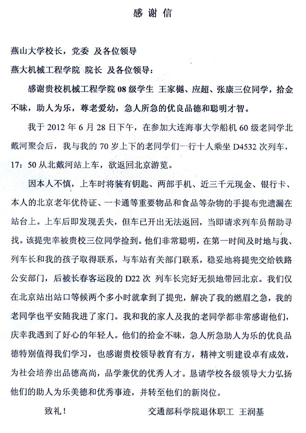 近日,我院收到了交通部科学院退休职工王润基先生的一封感谢信,王老先生在信中对机械工程学院三名08级本科生:王家樾、应超和张康表达了感谢之情,并详细叙述了事情的经过。