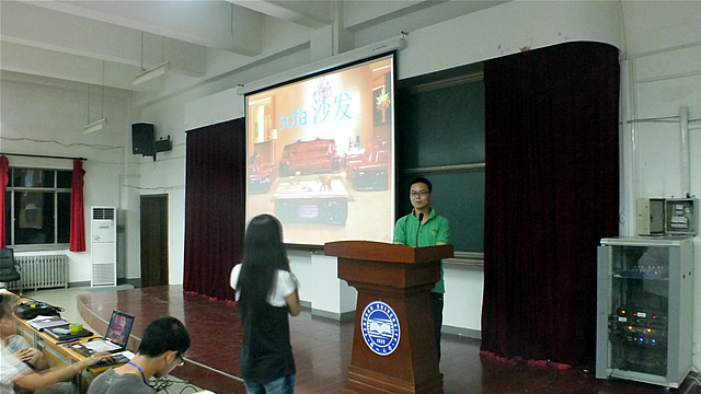 比赛在自我介绍和才艺表演中开始,进行的非常激烈。多种形式的自我介绍,与精心设计的幻灯片甚至是独具匠心的视频相结合,真可谓精彩不断。接下来的看图猜词把气氛推向高潮。最后一个环节——情景呈现也很精彩。参赛的同学们分别扮演不同的角色,每个人都竭尽全力的要表现出所扮演角色的特点。同学们的口语水平得到了评委们和在座嘉宾的肯定。