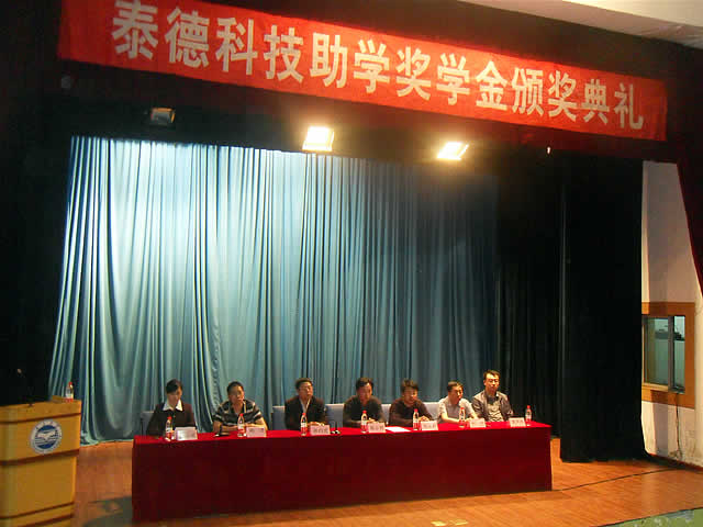 2012年5月16日下午15:00,泰德科技助学奖学金颁奖典礼在东校区二教演讲厅举行。出席本次典礼的领导及嘉宾有:秦皇岛泰德管业有限公司生产总调度张小朋先生,行政部经理郑彬先生,生产二部经理魏华伟先生,人力资源部经理杨名先生,乌鸦传媒学工处处长张向前,机械工程学院副书记副院长陈革新。