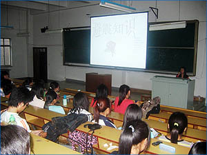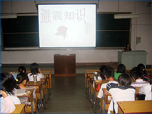 由于5月份我国四川省发生的强烈地震造成众多伤亡,为同学们传授一些自救知识是当务之急。张老师首先为同学们讲解了关于地震的一些常识和在地震来临时如何进行自救。她分别就在野外和室内两种情况如何进行避险进行了详细地介绍。此外,火灾也是生活中可能发生的并且直接威胁我们生命财产的重大灾难,对此,张老师以幻灯片的形式生动形象地讲解了关于火灾自救的知识,其中包括在教室、宿舍、礼堂、图书馆等处的防火和自救方法。