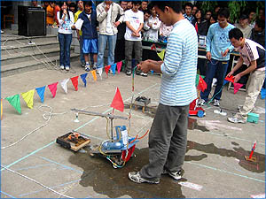 本次大赛分“专业组”和“趣味组”。参加专业组的有消防机械和运输机械,趣味组为 “斗牛”对抗赛。参与消防机械的有10队同学,分5组进行。每组两队分别沿规定路线扑灭指定火源,再争夺场地中心点的火源,以扑灭中心点火源的时间为比赛结束时间。运输机械为搬砖比赛,每队将砖搬到指定地点为赢!选手们制作的机械虽小,但方便实用,完成了预定的比赛内容。搬砖比赛中有的选手是从上往下去夹砖,有的是从下往上去铲砖,表现了他们的奇思妙想。每一件作品都凝结了选手们的智慧和心血,在场上纷纷展现各自的风采,比赛异常激烈,赢得了同学们的阵阵喝彩!最后的斗牛趣味比赛更是将比赛推向高潮,比赛场地四周赞叹声不断!