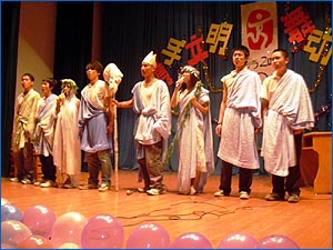 在同学们热切的期盼中,机自1班《好梦一日游》闪亮登场。他们通过幽默诙谐的表演方式道出了全体国人“支持北京,支持奥运”的共同心声。机自3班《圣火传说》再现了普罗米修斯为人类盗取火种的古老传说,他们样式奇特的服装,别具一格的表演给人耳目一新的感觉。成型3班《黒斯尼饭店》中超酷的装扮,搞笑的反串,夸张的表演,博得了在场同学的阵阵掌声,也反映了为迎奥运需整顿某些行业等现实问题。成型2班的《奥运版武林外传》将热播剧与奥运会巧妙结合,夺人耳目,充分显示了他们的创作与表演才能。机自6班的《选修课》笑料百出,在让同学们开怀大笑的同时也深刻反思那些普遍存在于校园中的不文明行为,颇具教育意义,对构建文明校园有一定的推动作用。机自9班的哑剧《Where is my water jug》通过水房丢壶事件反映校园道德问题,引起同学们的强烈共鸣,可谓“此时无声胜有声”。整场比赛精彩纷呈,掌声不断,笑声连连。最后,大赛评出一等奖(机自9班)、二等奖(成型3班)、三等奖(机自6班)、最佳男演员(成型3班田浩)、最佳女演员(成型2班张敏)、最佳创意奖(机自9班)。在同学们热烈的掌声中,此次大赛圆满结束。