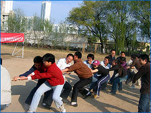 研究生们个个精神抖擞,十分活跃,一改往常的严肃和沉默,大家兴致勃勃,对每个比赛项目都跃跃欲试。“一二、一二……”现场正在进行火热的拔河比赛。号子声、加油声、呐喊声、欢呼声连成一片,几近沸腾。这时候每个班集体都拧成了一根粗壮的绳子,为班级的荣誉努力拼搏。