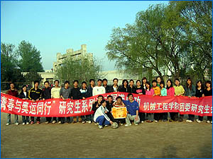 4月19日下午,和煦的春风拂弄着杨柳柔嫩的枝条,空气中溢满了丁香花的清香,小风雨操场上聚集了很多机械工程学院的研究生,他们正在举行以“青春与奥运同行”为主题的活动。这次活动是机械工程学院团委主办,由研究生会承办的,研究生一年级辅导员张岩岩老师和段艳宾老师为本次活动的顾问。活动前期举行了奥运知识与奥运礼仪的宣传活动。后期举行体育智力类比赛,它包括今天举行的拔河比赛、跳绳比赛、丢沙包比赛和踢毽子比赛,以及下周末要举行的羽毛球比赛、乒乓球比赛和棋牌类比赛。