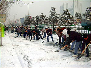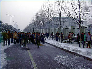 07年12月28日,秦皇岛市迎来了入冬以来的第一场瑞雪,大雪纷飞,景象喜人。虽说瑞雪兆丰年,但大雪同时也给我们带来了交通不便,道路过滑,行人易摔等许多问题。雪停后,机械工程学院05级党委书记陈子明老师迅速组织04、05级学生党员对燕大正门至铁三处十字路口段人行道、自行车道的积雪进行了清扫。