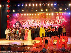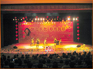 大厅中观众爆满,台前铺地的彩色气球加上两边悬挂的红色灯笼花祝福所有人平平安安、前程似锦。晚会首先播放了机械学院2007级各班独具特色的元旦祝福DV。接下来,劲爆火辣的现代舞,清新欢快的健美操,和谐完美的音乐盛宴——大一学生大合唱,现代版的“Hero”舞台剧等等各种各样的精彩节目陆续闪亮登场。机械学院八位女老师的拉丁舞把晚会推向第一个高潮,在彩色闪光灯的照耀下,老师们扭动的每一个舞姿都代表着对同学们的真诚祝福。笑料百出的相声把所有人的激情都调动起来了。大学中同学们最亲近的人——07级辅导员俞滨老师、张暾老师和张岩老师合唱的一曲《自由飞翔》给了同学们最欢乐的时刻,深情奔放的歌声赢得了同学们阵阵热烈的掌声,同时也把晚会再次推向了高潮。优美婉转的乐器演奏把观众带入了优雅的艺术殿堂。异彩纷呈的节目吸引了全校师生的眼球,给观众们以耳目一新的感觉。一曲《平安夜》给晚会画上了圆满的句号。许久许久,歌声、笑声、掌声交织在一起,响彻在美丽的燕大星空下。
