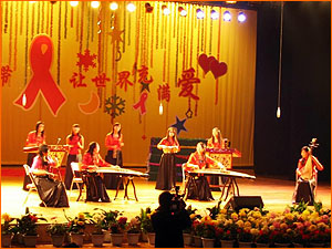 晚会在群星共唱的一首歌中开场。这首歌以艾滋病为主题,向人们介绍了艾滋病的传播途径、预防方法以及人们对艾滋病应持的正确态度,并且呼吁全社会来关爱艾滋病患者,与这次晚会的主题相吻合。此后,由秦皇岛市王志新副书记讲话。王书记介绍了艾滋病的历史、现状、防护及治疗,同时提醒当代大学生要爱护自己,保持良好的生活习惯,正确认识和预防艾滋病。王书记的讲话赢得了同学们热烈的掌声。在晚会现场,主持人还连线了山西临汾红丝带小学。在电话中,红丝带小学的医生为我们讲了红丝带小学的创建以及现状,并感谢有这么多的人关注他们。此外,红丝带小学的学生们还为我们演唱了《感恩的心》。也许他们的歌喉并不完美,但他们的歌声打动了现场每一位听众的心。我们落泪不仅是为他们的命运,而且是为他们那颗真诚的心和他们那份面对生活的执著与勇气。随后,雷锋突击队和菁苑艺术团的同学们给我们带来了动听的歌曲、感人的话剧和优美的舞蹈。每一首歌、每一场话剧、每一个舞蹈都充满了对生活的鼓励和憧憬,教会我们乐观地去面对生活。其中由雷锋突击队精心策划导演的话剧《天使在人间》感动了在场的所有人,它讲述了一个艾滋病妈妈的故事,她临终留给女儿的遗言是:记住,只要你愿意,生活的阳光永远属于你。它教会每一位艾滋病患者要勇敢、乐观地面对生活,无论命运多么的坎坷都要充满斗志去挑战,而不应向命运低头。