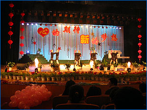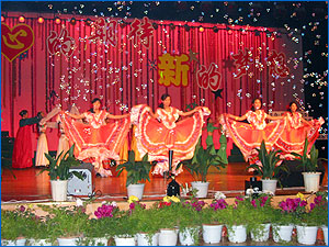 在缤纷的焰火、闪亮的灯光下,极富动感的健美操拉开了此次晚会的序幕,活泼健康的舞姿,展现了当代大学生蓬勃的朝气。我院教师为同学精心准备的《风情拉丁舞》,高雅的舞姿,优美的音乐,将晚会推向了高潮。互动环节中,06级本科各班级代表带来了对全院师生最诚挚的新年祝福,06级研究生代表也献上了四副对联。随着礼花,数百个彩色气球,承载着大家不同的新年愿望从天而降,新年的欢乐、喜悦之情充满了会场。在主持人的建议下,全场观众,为新年许下心愿,那一刻时间凝固,真情永存,大家美好的愿望一定会实现。最后06级新生的合唱的《让我们荡起双桨》、《同一首歌》将晚会推向最后高潮,晚会圆满结束,大家还沉浸在无边的欢乐中。