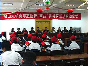 “两站”即大学生志愿者服务站和大学生家教联络站,该活动由海港区团委发起,团结里社区和先茂里社区同机械工程学院团委共同主办。活动在团市委领导和区委领导的大学生社会实践基地揭牌仪式中拉开序幕。在启动仪式中,机械工程学院党委副书记副院长高鹏飞,文化路和西港路街道办事处主任分别发表讲话,对大学生志愿者提出希望和要求,雷锋突击队志愿者代表发言表示了决心,志愿者们还为社区里残疾人家庭、特困家庭的小朋友们带去了学习用品。