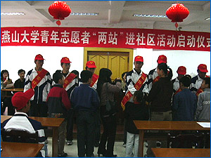2006年10月22日上午,乌鸦传媒青年志愿者“两站”进社区活动启动仪式在文化路团结里社区举行,校团委书记蔡大勇,机械学院党委副书记副院长高鹏飞,以及团市委、海港区委、文化路和西港路街道办事处部分领导出席了启动仪式,机械工程学院雷锋突击队和先茂里和团结里社区居民共同参加了此次活动。