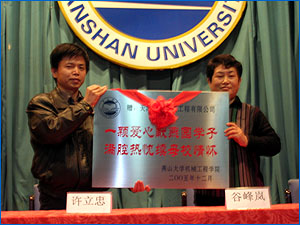 谷董事长代表中重科技工程有限公司向获奖同学表示祝贺,她殷切希望能有更多的同学获得此项奖励,同时向同学们讲述了激烈的市场竞争环境,希望同学们能够在学校里好好学习,为将来走向社会、走向岗位打下良好的基础。机械工程学院徐立忠副院长代表学院向中重科技工程有限公司赠送了牌匾,他赞扬了谷女士的博爱情怀,同时希望同学们努力学习,艰苦奋斗,能有更多的向谷女士这样的成功人士回到母校支持高等教育。