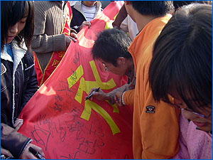 “永远跟党走 青春献祖国”倡议签名活动分为三个部分。第一部分,重温入团誓词。在学生代表的领诵下,全体团员心潮澎湃,重温入团誓词,激昂的誓言回荡在每位团员的心中。第二部分,宣读倡议书。机械工程学院团委向全校的团员青年发出倡议:每一位团员都要以服务同学、服务社会、服务人民为己任,从小事做起,从现在做起,今天我们团结友爱、互相帮助、服务同学,就是明天我们服务社会、回报人民、报效祖国的起点和开始。第三部分,签名活动。每位团员都积极踊跃地在“永远跟党走 青春献祖国”条幅上签了名,作为行动的见证,以表其争做先进,不愧有为时代,不负青春年华的决心。