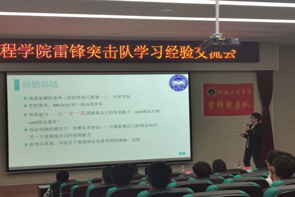 2020年10月17日晚,雷锋突击队于东区机械馆J3报告厅针对大一新生举办了一场学习经验交流会。本次学习经验交流会的主题为“共享经验与方法,提高效率和能力”。这次学习经验交流会邀请到四位才学兼备的学长学姐为大一新生答疑解惑。