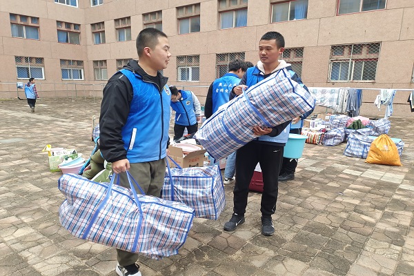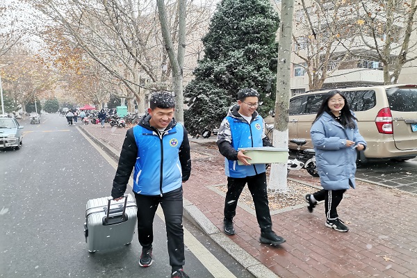 从早上8:30开始,雷锋突击队的成员进入东区第二宿舍楼帮助女生将较重的行李陆续搬下宿舍楼,帮助他们将行李进行整理和打包后运往第七宿舍楼并搬到相应宿舍。虽然行李较多,天气寒冷,但依旧阻挡不了志愿者们的热情和帮助同学们的决心。在搬运过程中,雷锋突击队的队员们团结一致,以最快的速度完成了行李搬运工作,大大减轻了女生们的搬运负担,提高了搬运的效率。
