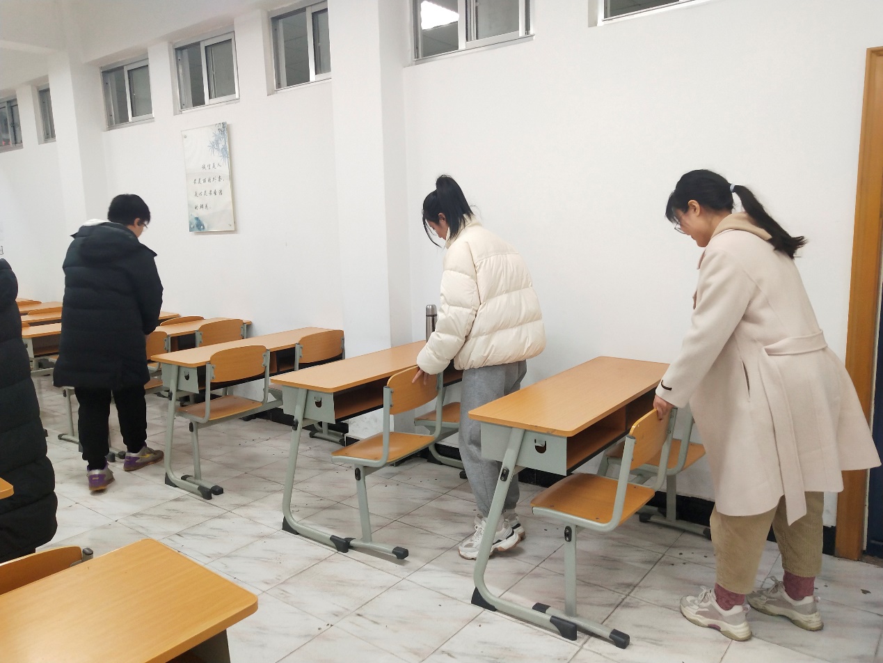 活动前,支部书记把支部党员分成了三组,每组五间教室,负责整理摆放教室桌椅,清洁教室黑板和桌面。活动过程中,支部党员积极热情参与,互助合作,不仅对教室的黑板和桌椅进行清洁和整理,还引导前来学习的同学们保持良好的教室环境卫生,自觉维护教室的干净文明。此次活动中,党员同志分工协作、配合密切,为四六级考试营造了良好的考务环境和氛围。