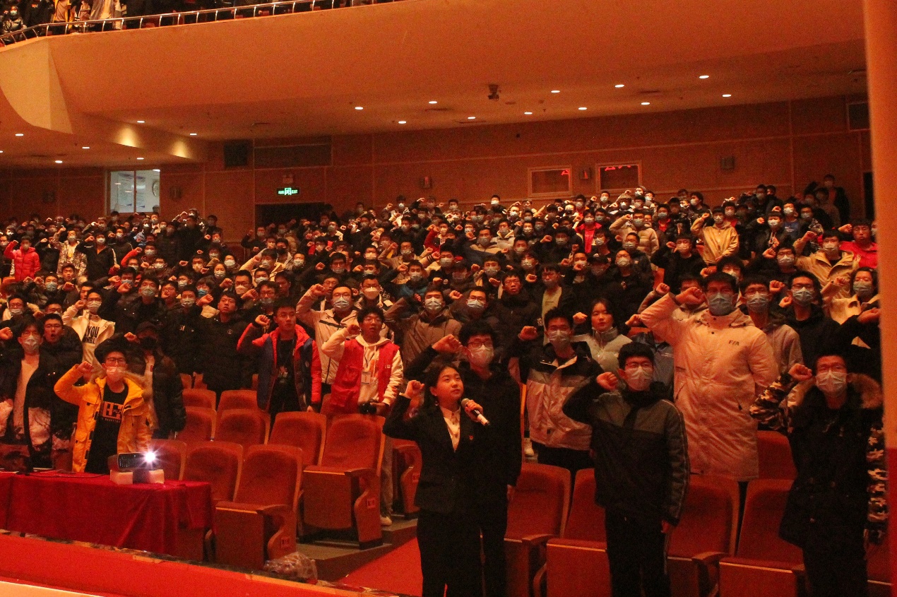 表彰环节后,董国疆作总结性讲话,他充分肯定了受表彰同学的优秀事迹,结合时代背景及我校校情向同学们提出立志、立身、立学的要求,希望同学们能够紧跟时代潮流,勇担时代重任,把勤奋学习作为人生进步的重要阶梯,把深入实践作为成长成才的必由之路。会议最后,由“风华机械人-抗疫特别人物”陈嘉硕带领现场全体学生宣誓。