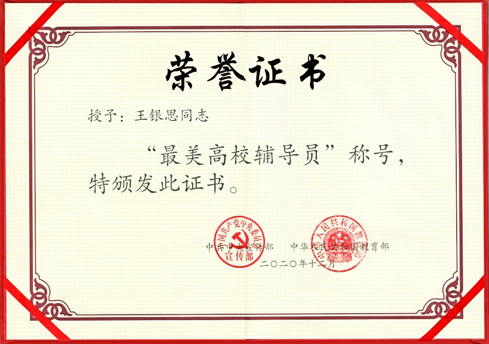 高校辅导员,是大学生成长成才的人生导师和健康生活的知心朋友,是开展大学生思想政治教育的骨干力量。日前,中央宣传部、教育部从全国14.8万高校在岗专职辅导员中,评选出10名2020年“最美高校辅导员”,并联合发布其先进事迹。我校机械工程学院辅导员王银思获此殊荣。