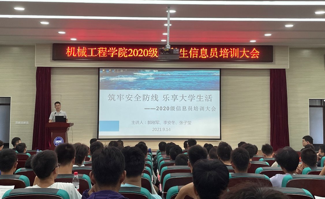 为切实推进大学生心理健康教育工作,为学生营造快乐学习、健康生活的良好氛围,2021年9月14日下午,机械工程学院面向2020级本科全体团支书、心理委员、宿舍信息员共计179名学生开展了以“筑牢安全防线,乐享大学生活”为主题的培训。此次活动由2020级辅导员郭刚军老师主讲,2020级辅导员张子莹、李安冬参加了此次讲座。